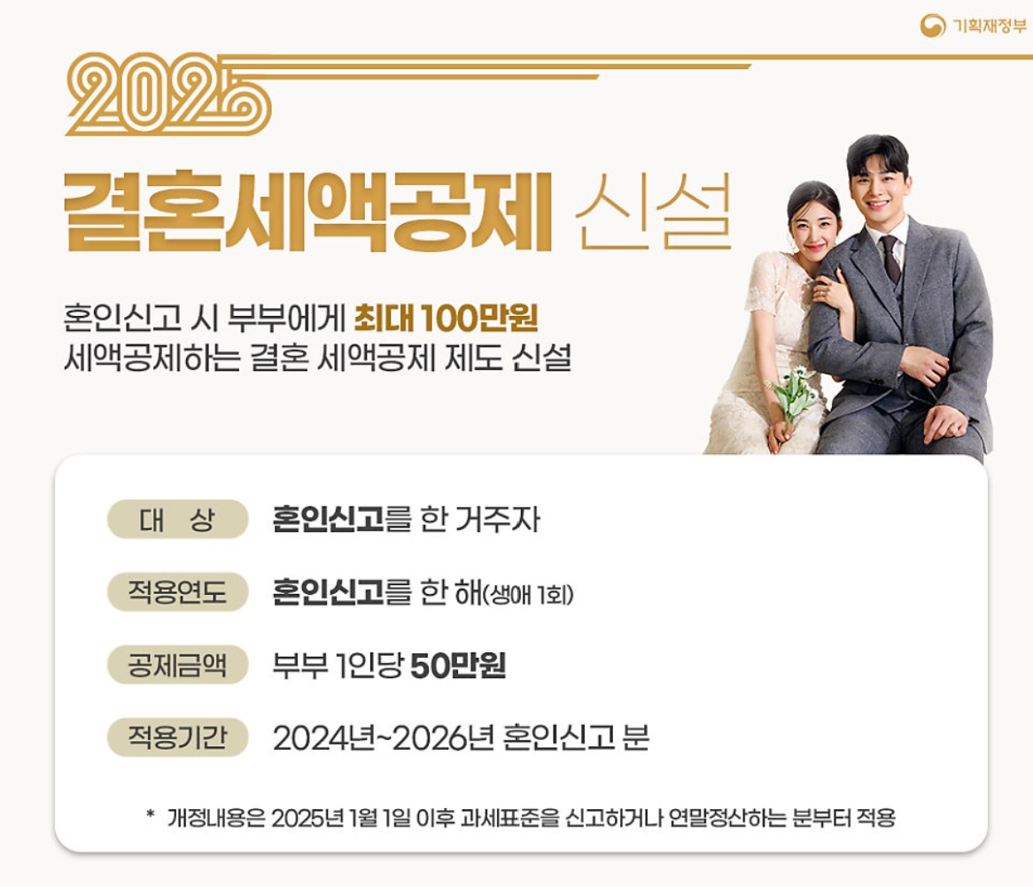 정부에서 혼인한 부부에게 최대 100만 원의 세금을 돌려주는 제도입니다. 신혼부부의 경제적 부담을 줄이기 위해 2024년부터 3년간 한시적으로 시행됩니다.