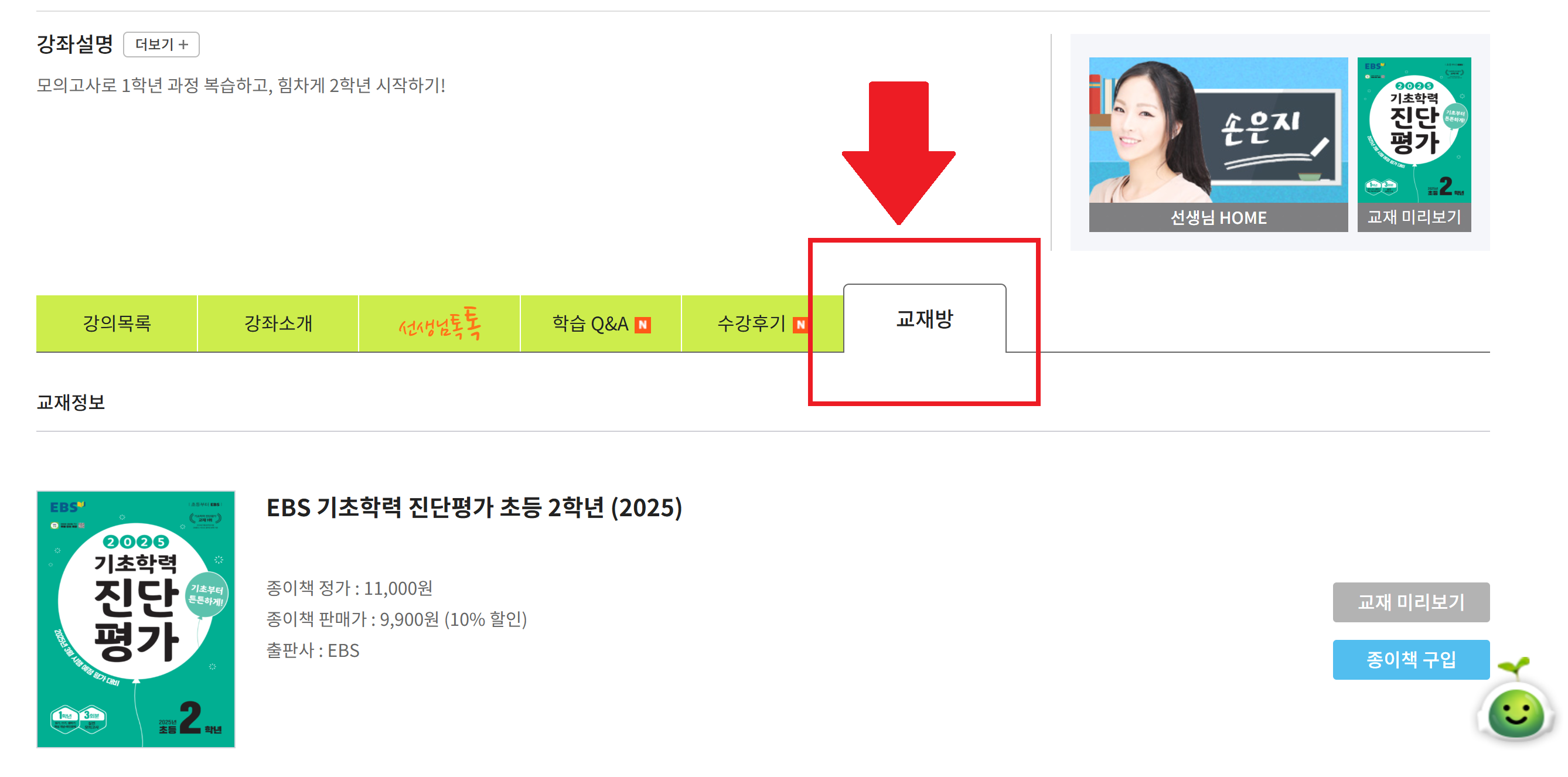 검색 결과에서 원하는 강좌 선택후 교재방 메뉴 클릭.