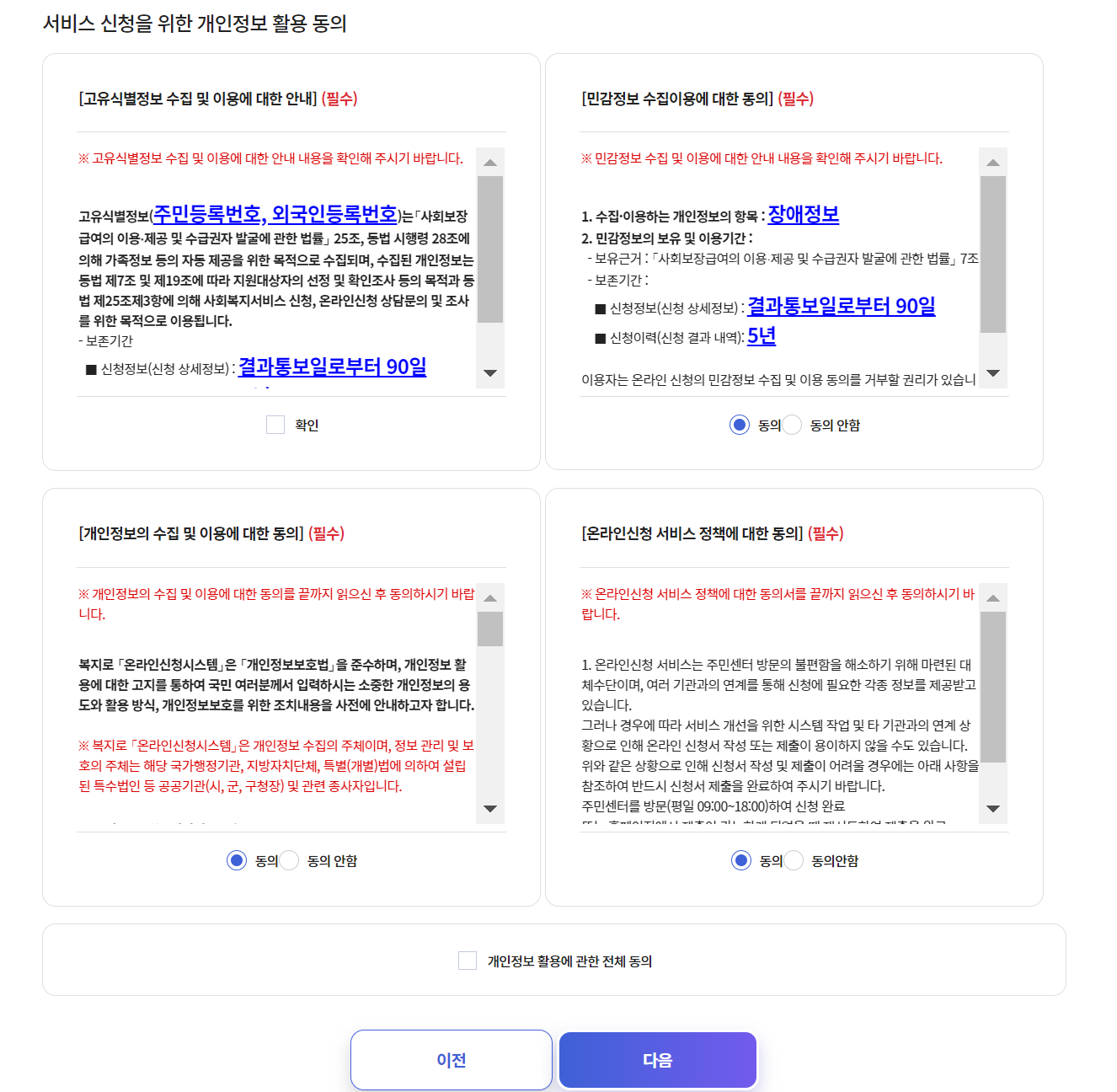 모두 동의하시고 다음 버튼을 클릭하여 신청서 작성을 완성해주시면 됩니다.
