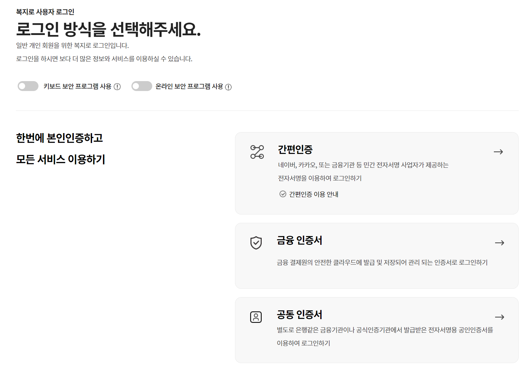 3. 로그인 방식을 선택합니다. 네이버,카카오 등 여러 금융기관에서 제공하는 간편인증과, 금융인증서, 공동인증서를 이용하여 쉽게 로그인 할 수 있습니다.