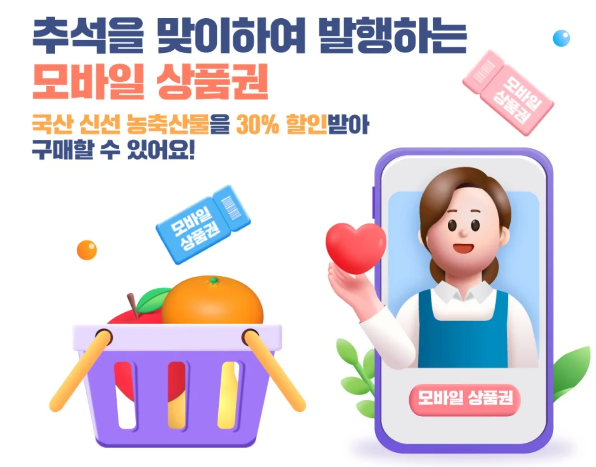 농할상품권은 국산 신선 농축산물을 30% 할인된 가격에 구매할 수 있는 모바일 상품권입니다. 추석을 맞아 발행되어, 합리적인 가격에 신선한 농산물부터 축산물까지 다양하게 구매할 수 있어요.