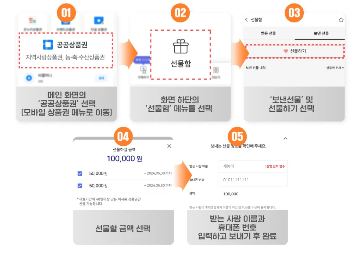 6. 받는 사람 이름, 휴대폰 번호를 입력후 보내기를 하면 완료됩니다.