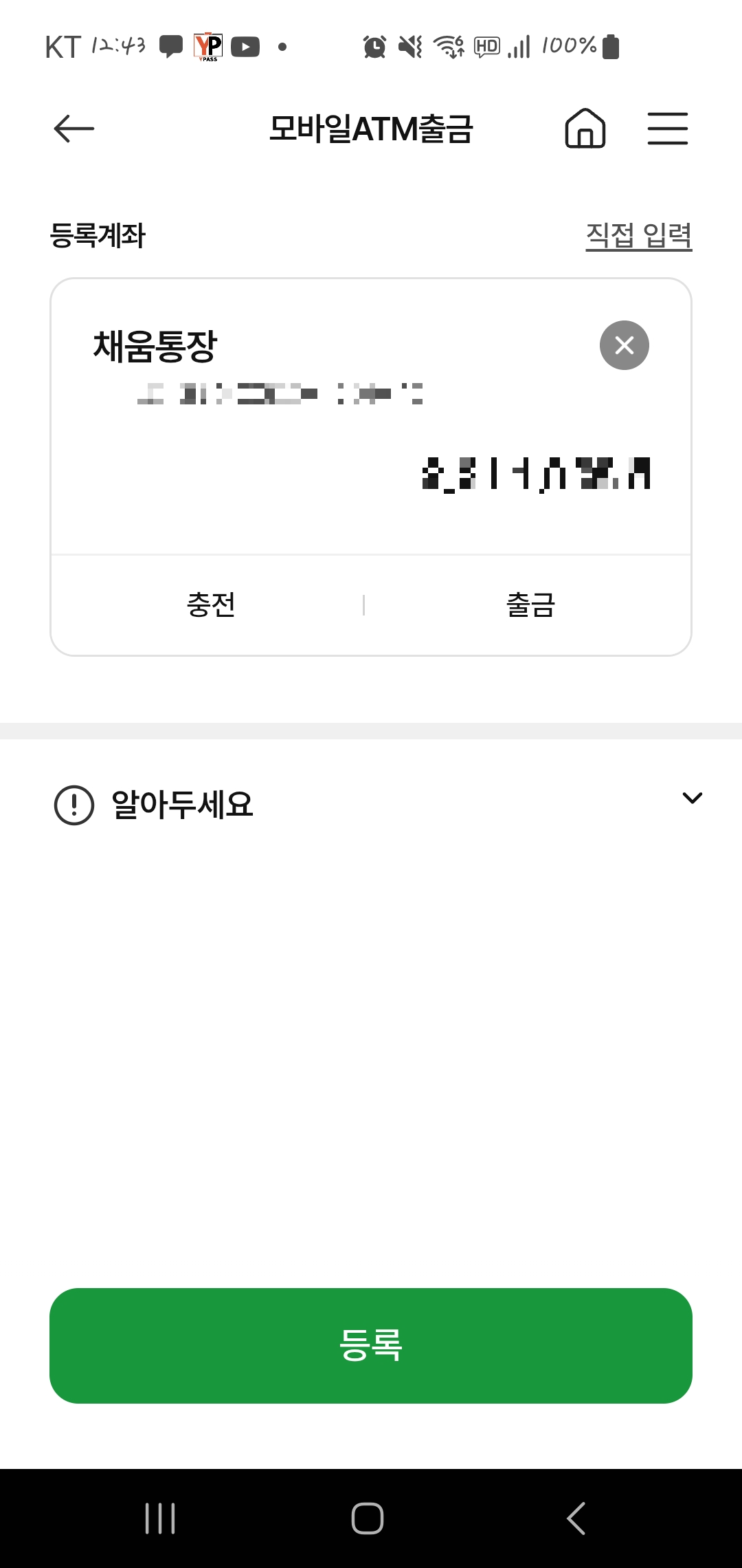 A. 모바일 ATM 출금은 반드시 본인 명의의 농협 계좌 및 휴대폰에서만 가능합니다. 가족이나 친구의 휴대폰으로는 이용할 수 없습니다.