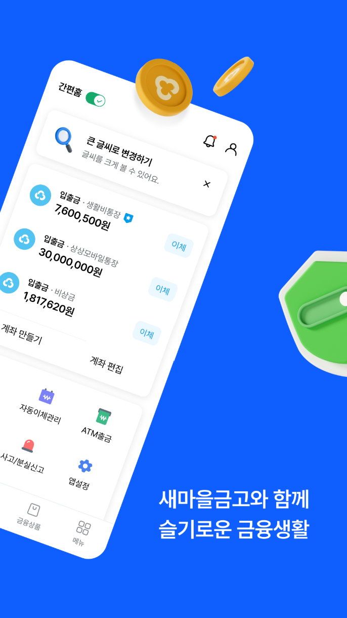 - 보유한 새마을금고 계좌를 앱에 등록하고, 잔액 조회 및 거래 내역 확인이 가능합니다.