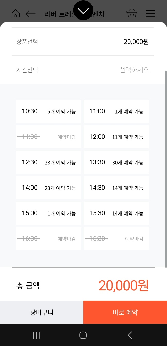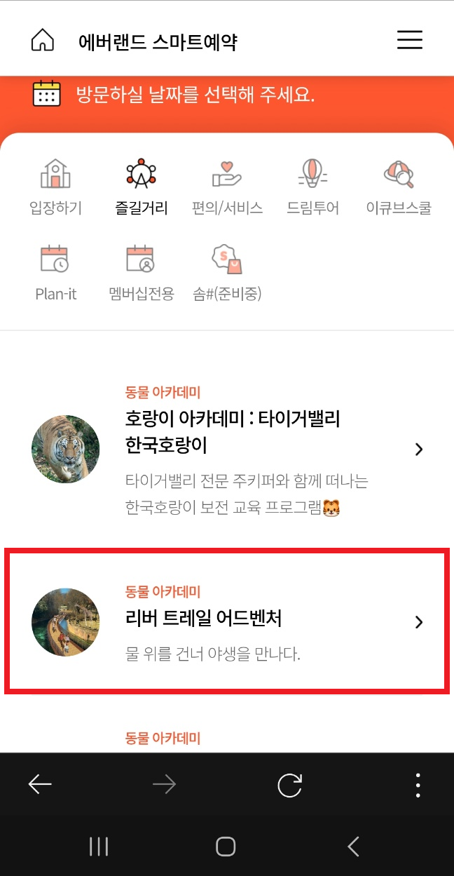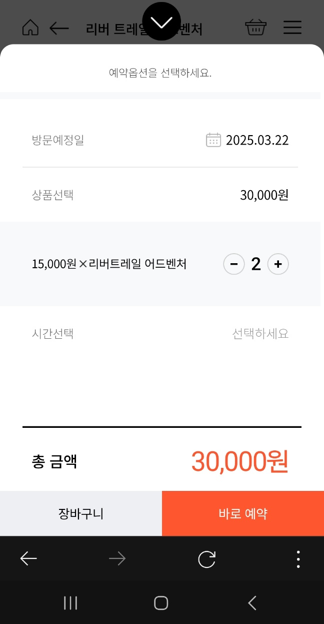 - '리버 트레일 어드벤처' 검색 후 체험 날짜 및 시간 선택