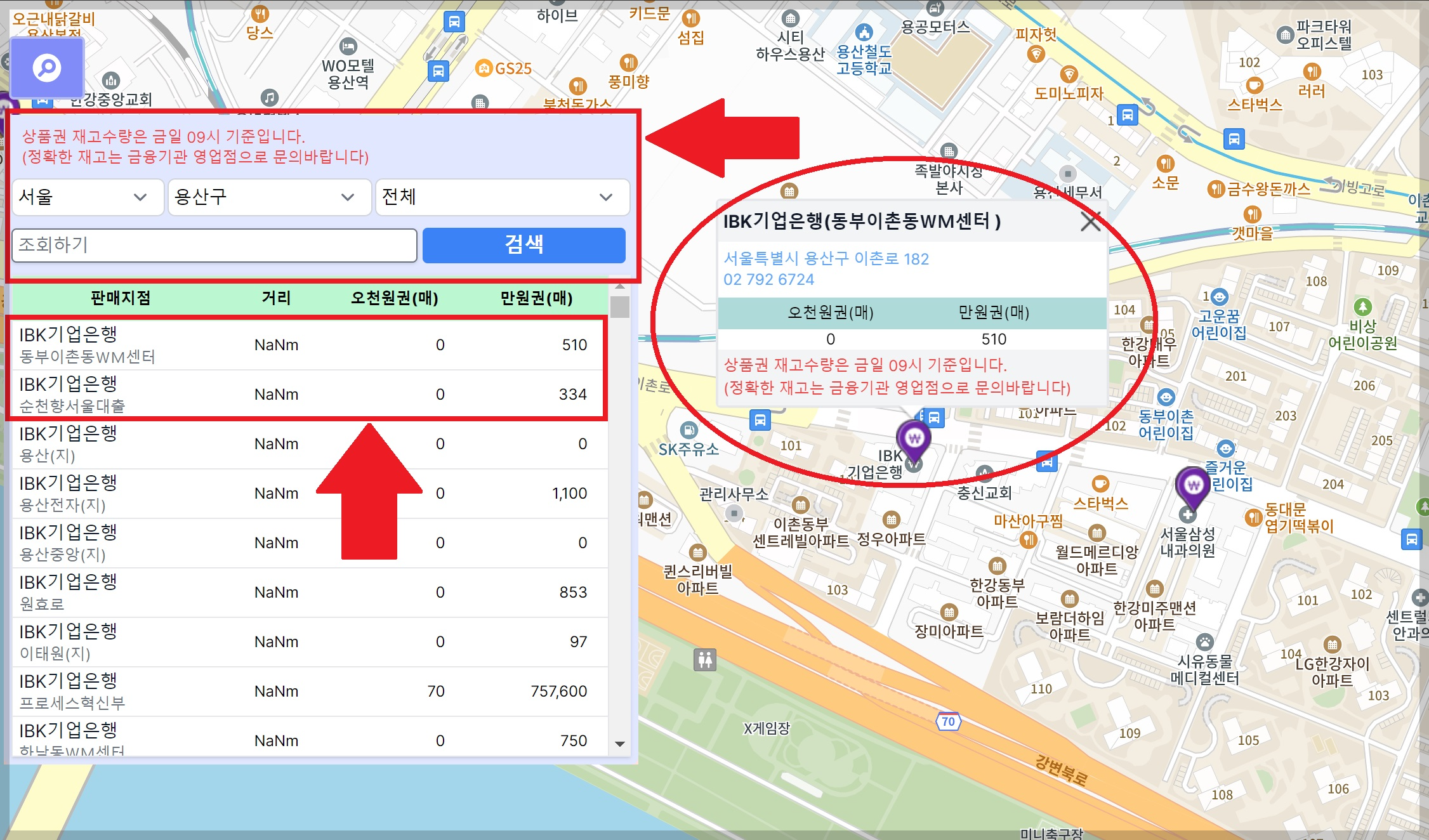 3. 판매 지점이 검색되면 재고 수량을 확인후, 수량이 남아있는 지점을 클릭하면 은행의 위치를 확인해 볼 수 있습니다.