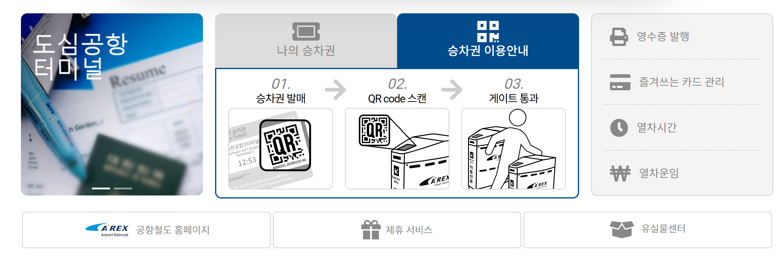 | 이용방법 | 직통열차 승차권의 QR코드를 도심공항터미널 게이트에 스캔하여 입장 및 이용 |