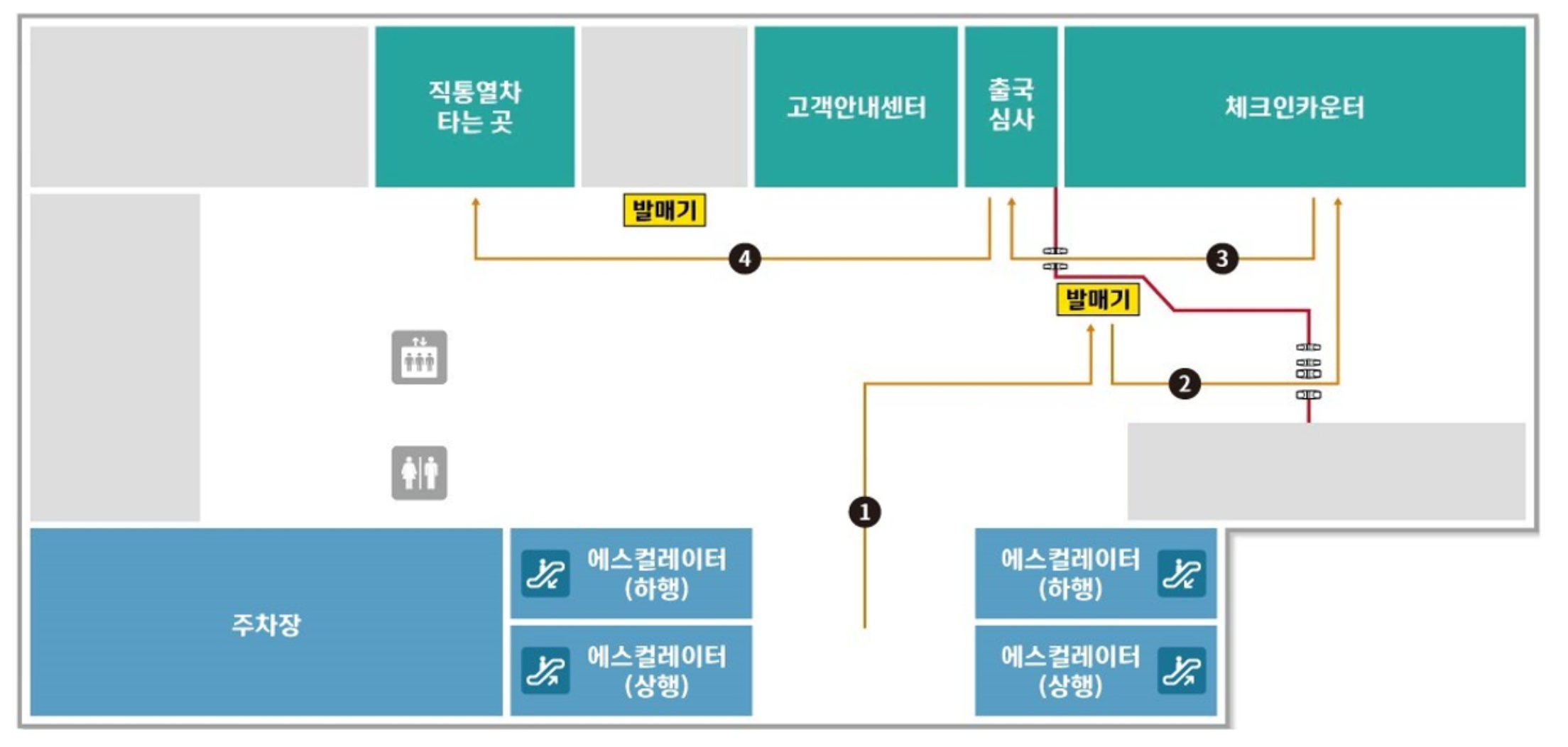 ✔️ 출국심사 후에는 반드시 공항철도 직통열차를 이용해야 합니다.