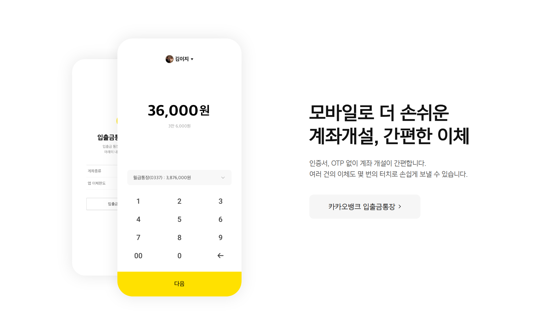 • 송금: 상대방 계좌번호 또는 카카오톡 친구에게 빠르게 송금.