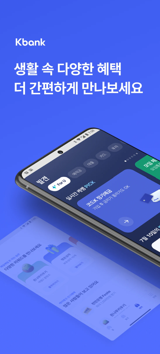 케이뱅크는 번거로운 서류 제출 없이 스마트폰만 있으면 계좌 개설이 가능한 혁신적인 인터넷은행입니다.
