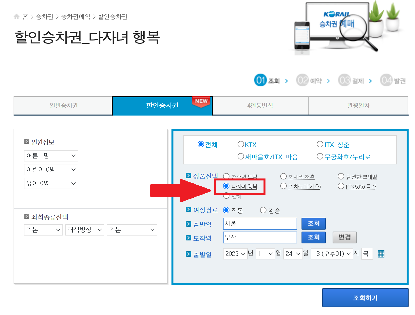 다자녀 할인은 열차별 승차율에 따라 적용됩니다. 원하는 시간대에 할인 열차가 없거나 매진될 수 있으니 미리 예약하는 것이 중요합니다.
